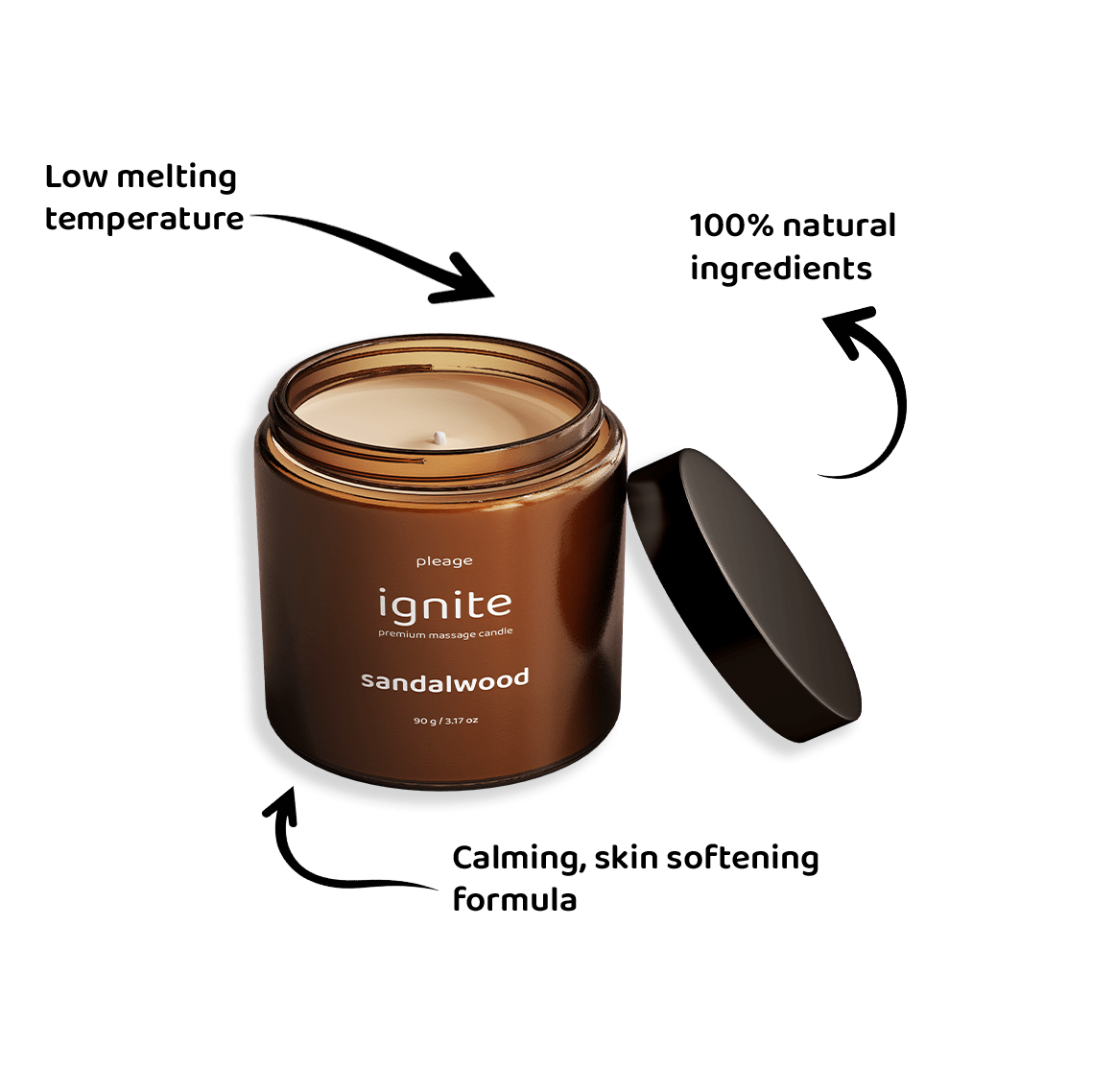Ignite's jojoba and soybean-oil based formula has a low melting point which ensures the candle oil gets warm and not too hot. The oil can be poured directly onto skin once melted and extinguished. Always check the temperature of the glass and oil and let it cool down for 2 minutes if needed.
